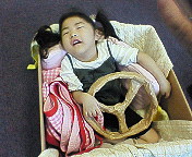 写真はダンボールのバスに乗るしずくです♪