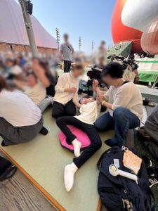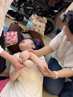 座ったままでも寝たままでもできるヨガです。ボランティアのPTさんもついてくれて一緒に楽しみました。