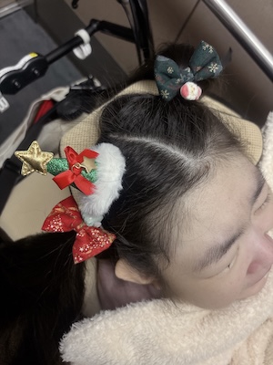 クリスマス週間ってことで毎日髪飾りはクリスマス仕様にして出かけて行ってます